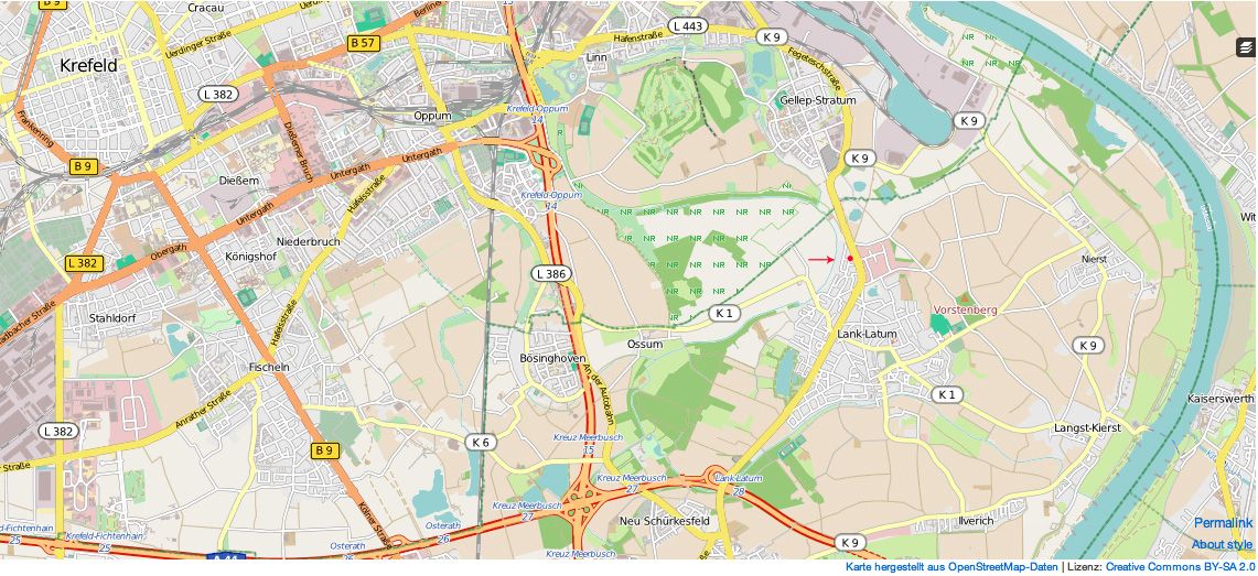 Zwischen dem Autobahnkreuz Meerbusch und der Ausfahrt Düsseldorf Messe/Stadion, über die Ausfahrt Nr.28 Lank-Latum die Autobahn verlassen.